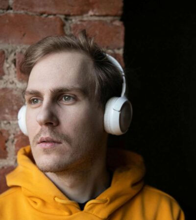 A traffic marshal is standing on the street wearing a bright yellow safety vest with reflective stripes, directing vehicles. The background shows an urban setting with blurred lights and a few cars, and the foreground includes some green foliage.